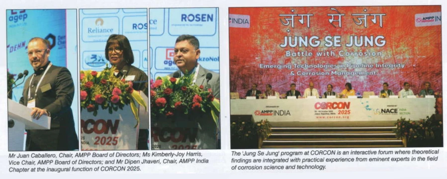 “Our nation is building infrastructure at an unprecedented pace! India plans to spend nearly Rs 143,000 crore on infrastructure between the years 2024 and 2030. The Union Budget of 2025-26 alone has marked a record Rs 11.21 lakh crore, which is around 3.1% of our GDP. This is towards capital investment in infrastructure alone. Over the last decade, capital expenditure on infrastructure has grown five-fold, and by 2050, India will require around US$2.4 trillion in urban infrastructure investments,” said Mr Dipen Jhaveri, Chair, AMPP India Chapter. He was speaking at the inaugural function of CORCON 2025 at the Jaipur Exhibition and Convention Centre on October 6, 2025. “These facts make one thing clear, that as India builds more pipelines, refineries, petrochemical units, steel plants, power plants, and fertilizer units, more water. With systems and urban infrastructure, the demand for robust corrosion protection technologies has never been greater.